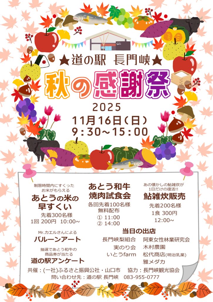 2025 11月16日(日) 9:30~15:00 道の駅長門峡にて【道の駅長門峡 秋の感謝祭】が開催されます。